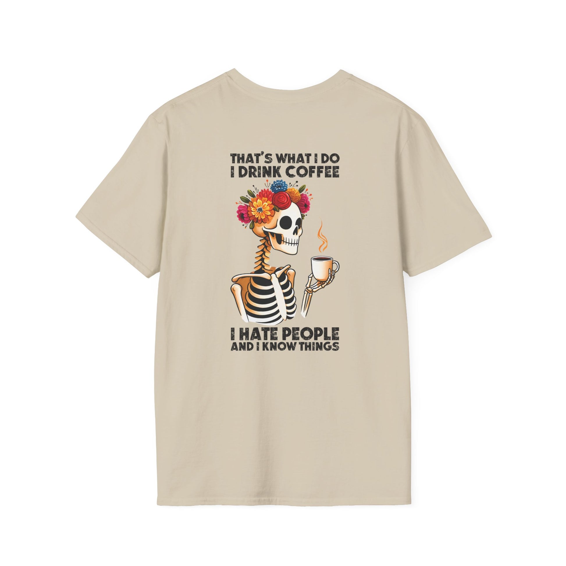 For the introvert with razor-sharp wit and a standing date with their mug. This soft, unisex tee features a floral-crowned skeleton raising a cup of hot coffee with the immortal mantra: “That’s what I do—I drink coffee, I hate people, and I know things.” Wear it to signal “approach at your own risk (bring espresso).”